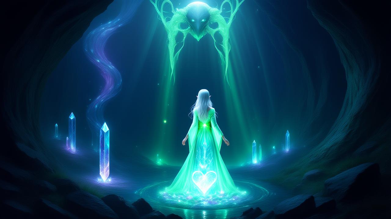 Während die Dunkelheit sich langsam ausbreitete, spürte Serenya die Schwere der Bedrohung. Ihr Herz begann zu schlagen, als hätte es plötzlich eine neue Rhythmusfindung. In diesem Moment erschien ein alter Kristallgeist, dessen Körper aus glitzerndem Glas war, und sprach mit einer Stimme, die wie das Flüstern der Sterne klang: