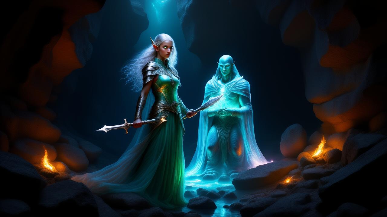 Sie setzte sich, während der Wind das glitzernde Gestein wie ein Echo der Vergangenheit berührte. Die Flüsterklinge, ein Instrument aus silbernen Knochen und schimmerndem Kristall, lag in ihren Händen. Der Klang, den sie von ihr herausholte, war das Echo verlorener Gefühle. Sie spielte darauf und hörte, wie die Schatten, die sich in den Wänden formten, in leises Rauschen verwandelten.