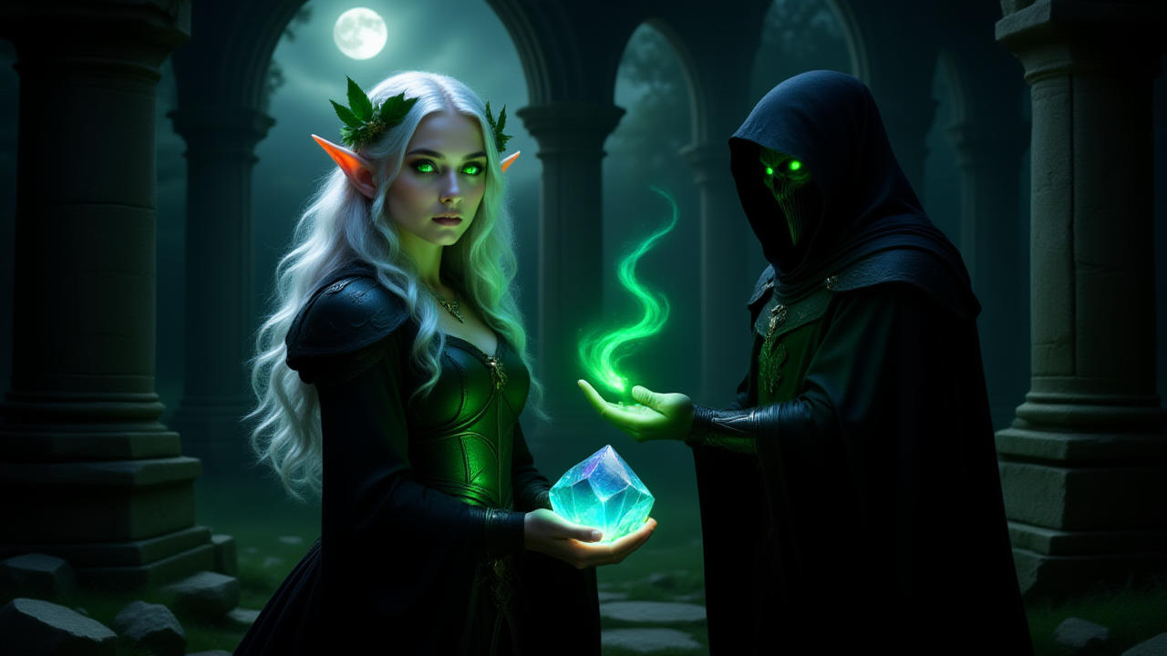 Am Ende des Gebirges erreichte sie eine alte Ruine, die seit Jahrhunderten verfallen war. In der Mitte des Gebäudes stand ein kristallines Artefakt, das in allen Farben des Regenbogens schimmerte. Die Prophezeiung versprach, dass das Artefakt die Dunkelheit vertreiben würde. Doch ein finsterer Magier namens Morgrin, der schon seit Ewigkeiten die Schatten manipulierte, folgte ihr heimlich. Als er das Artefakt erreichte, schaltete er einen mächtigen Zauber, um es zu erobern.
