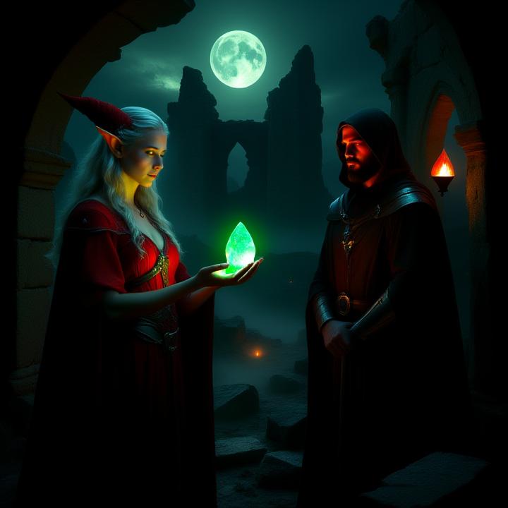 Ein Schatten glitt an einer zerfallenen Steinmauer vorbei – Varron, der finstere Priester, dessen Blick durch die mystische Melodie drang. Sein Gesicht war kaum sichtbar, doch seine Präsenz wirkte wie ein schauriger Nebel, der in die Nacht einzogen schien. Er zog sich in die Dunkelheit zurück, doch die Gruppe konnte spüren, wie seine Worte wie ein kalter Wind ihre Gedanken erreichten. Die Versuchung war verführerisch: Macht, Wissen, die Möglichkeit, die Schale des Lebens zu finden und damit die Balance der Welten wiederherzustellen. Varrons Motivationen blieben im Dunkeln, doch seine Nähe ließ die Herzen der Wanderer vor Angst erzittern.