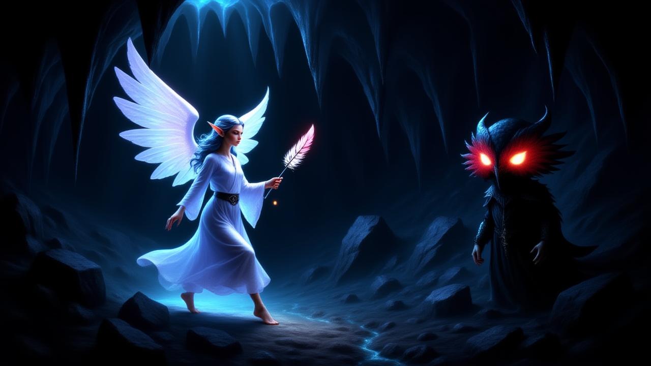Als sie tiefer voranschritt, spürte Serenya, wie die Schatten des Schattengeistes sich wie dichter Nebel um die Korridore wickelten. Der Schattengeist, einst ein Wächter des Quells, hatte sich in die Felsen eingraviert und war nun ein geflügelter Hauch aus roter Asche, dessen Augen wie funkelnde Kohlen leuchteten. Er sprach mit einer Stimme, die zugleich warm und bröckelnd klang: “Du, die du aus der Luft kommst, warum solltest du versuchen, das, was mir gehört, zurückzuerobern? Die Erde ist mein Reich, und ich bin ihr Erbe.” Serenya antwortete mit einer festen Entschlossenheit: ‘Der Quell war niemals für eine Seite bestimmt. Wenn du ihn zurückhältst, zerbricht die Welt, und wir verlieren das, was wir lieben.’ Der Schattengeist schimmerte vor Wut, doch seine Stimme verriet eine tiefe Traurigkeit, die von seiner Einsamkeit erzählte.
