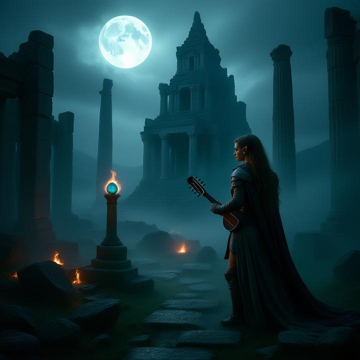 Im Herz des Wispernden Nebels, umgeben von zerklüfteten Ruinen eines alten Elfen-Tempels, stehen Serenya und ihr neu gewonnenes Gefährte Elarion. Der Nebel wirbelt um ihre Köpfe, während er die schwachen, silbrigen Spuren ihrer Mondstein-Sphäre widerspiegelt. Eine Stimme, kaum mehr als ein leiser Rauschen, schwebt aus dem zerfallenen Altar, ruft nach der Schale des Lebens.