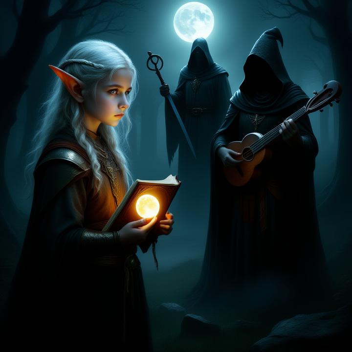 In der Ferne erkannte Serenya ein zischendes Flüstern, das aus dem Nebel kam – ein Mädchen, das die Laute schwang und in ihrer Hand ein rotes Haar trug. Sie war Myra, die Musikmagierin, die die Schatten tanzen ließ. Ihr rotes Haar, das im Mondlicht schimmerte, war ein Symbol ihrer unbändigen Leidenschaft.
