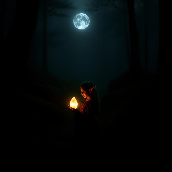 In der düsteren Kluft des Asch-Waldes stand Serenya, die junge Elfe, ihr Gesicht von den schimmernden Aschwolken überschattet, die den blutroten Himmel zu einer endlosen Melodie aus Staub und Schimmer verwandelten. Der Mondstein, der sanft an ihrer Lederschnur hing, pulsiert wie ein Herz im Einklang mit dem Wald. Seine warme, heilende Strahlkraft wärmte die Kälte, die die Erde umhüllte, und ließ die Moosbedeckten Felsen in einem zarten Silberglanz erstrahlen.
